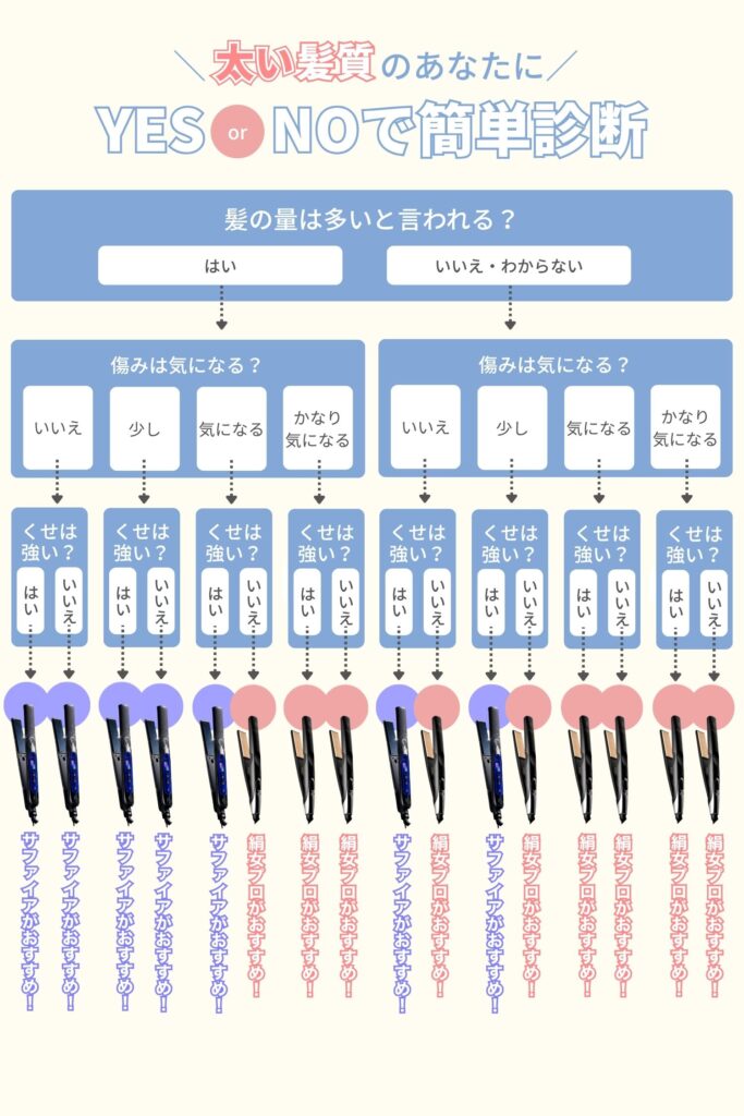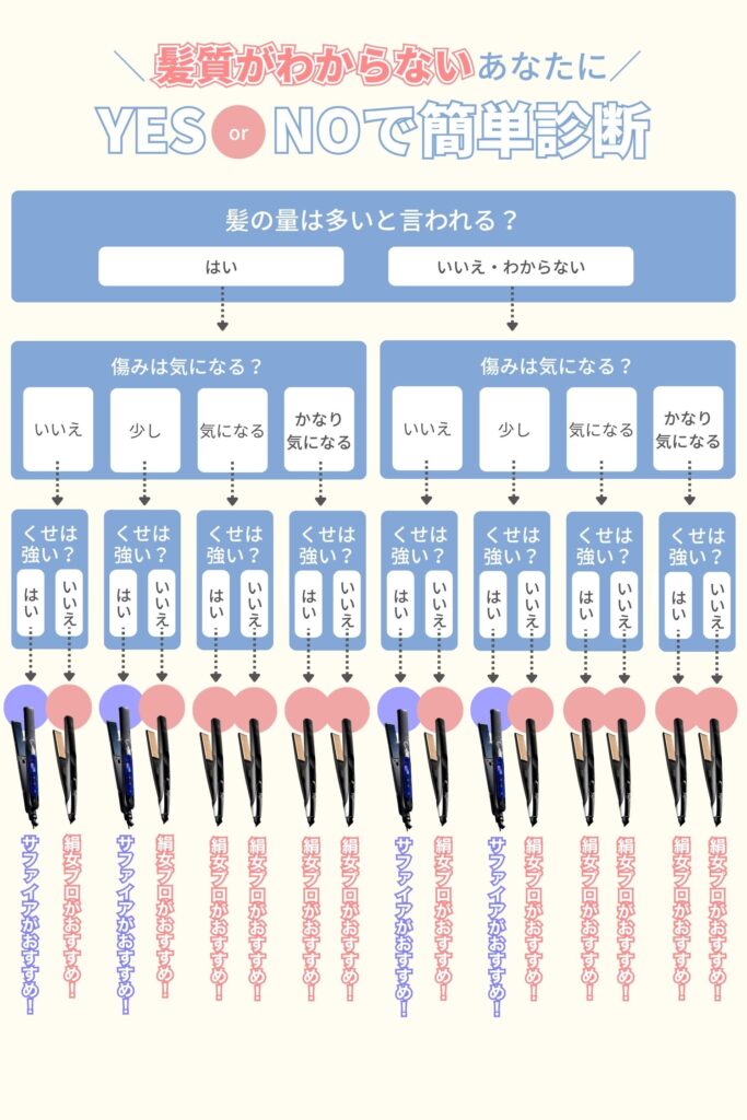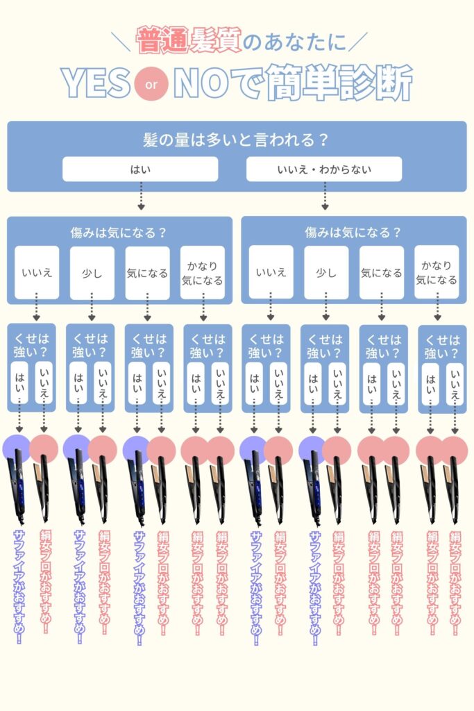 普通髪質のあなたは髪の量が多くくせが強い場合にサファイアとの相性が良くなりやすい印象です。くせが強くない場合は基本的に絹女プロの方が合いやすい結果となっております。