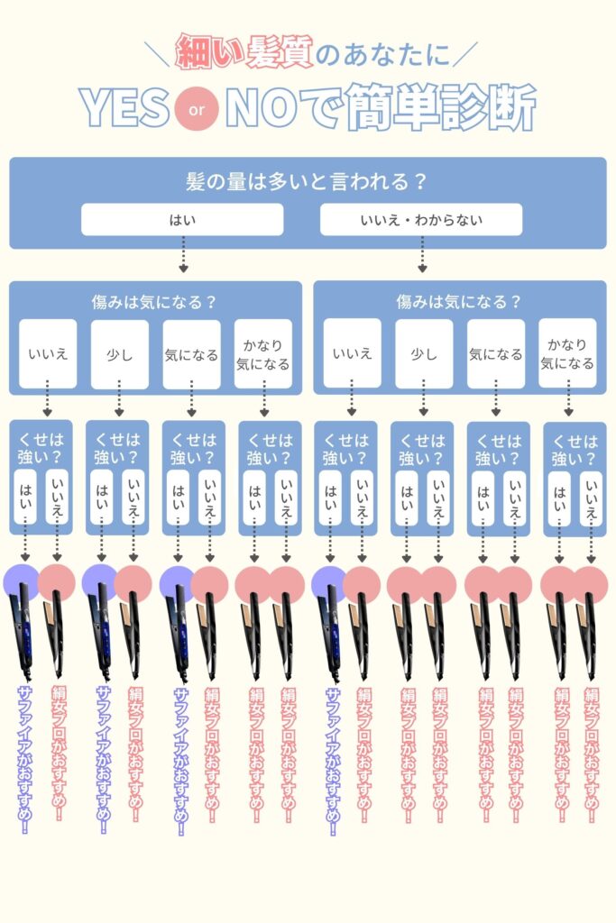 細い髪質のあなたは全体的に絹女プロの方が相性が良いケースが多く、くせが強く髪の傷みが気にならない〜気になる場合にはサファイアとの相性が良くなる印象です。