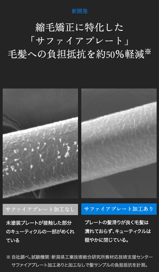 と不安に思われることかと思いますが、サファイアプレート加工をしたものとしていないものを比較すると、ヘアアイロンを通す際に髪を引っ張ってしまうことによる摩擦を約50%カットできたという実証結果もございます。